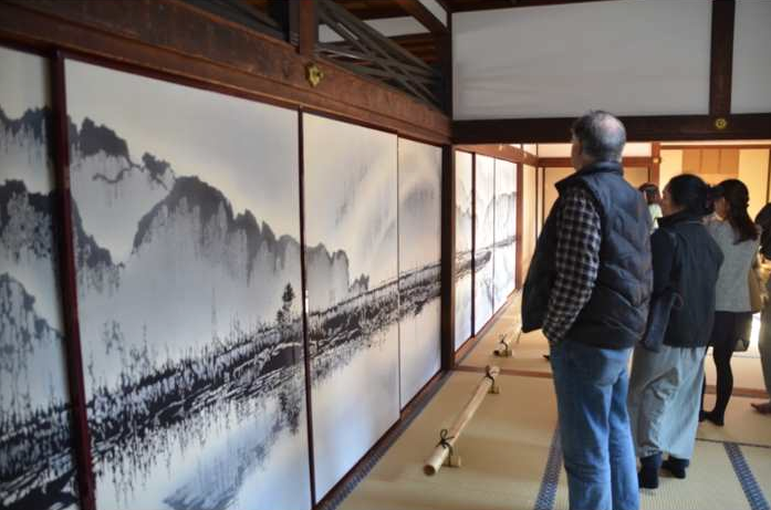 一般公開に先立つオープニングセレモニーでは、坂井田良宏建仁寺派宗務総長の開会ご挨拶の後、鳥羽美花から小堀泰巌建仁寺管長に目録(16面の襖絵)が贈呈され、小堀管長のご挨拶があり、続いて、チャン・ドウク・ビン・ベトナム社会主義共和国在大阪総領事、さらに公務の後、駆けつけられた門川大作京都市長よりご挨拶を頂いた。 続いて鳥羽美花より、作品制作に関連し、太田洋三・松伊製糊工場代表および太田篤氏、表具師の内藤康博・松錦堂代表取締役、白山紬の株式会社西山産業・定舎勝利氏、取手制作の株式会社安藤七宝店柴田明氏を紹介し、今後は、共同制作のパートナーとして前に進ませて頂きたいと挨拶した。