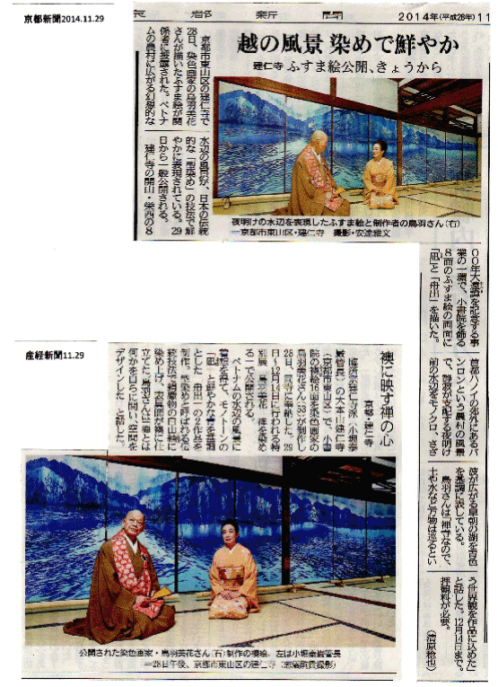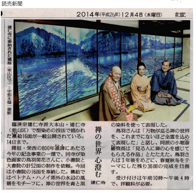 開山栄西禅師八百年大遠諱慶讃特別展「鳥羽美花―禅を染める」は2014年11月29日より12月14日まで、建仁寺にて開催された。開山栄西禅師八百年大遠諱慶讃事業として、鳥羽美花は建仁寺に52面の襖絵をご奉納することとなったが、その第一章として、小書院の襖絵16面(『凪』『舟出』)が完成し、公開する運びとなった。
